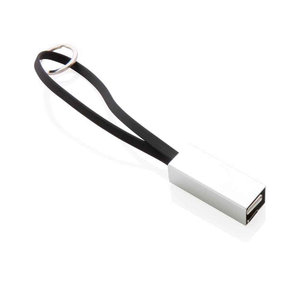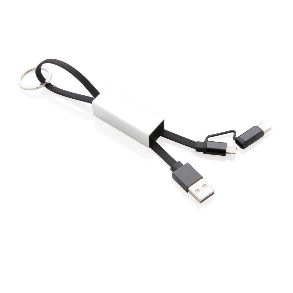 Moderne 3-in-1 kabel met type C en dubbelzijdige connector voor iOS- en Android-apparaten die een micro-USB nodig hebben. TPU kabel met aluminium connectoren en aluminium beschermhoes. Met sleutelhanger ring. Geschikt voor opladen en synchroniseren. Lengte 15 cm.
