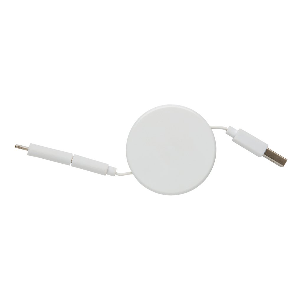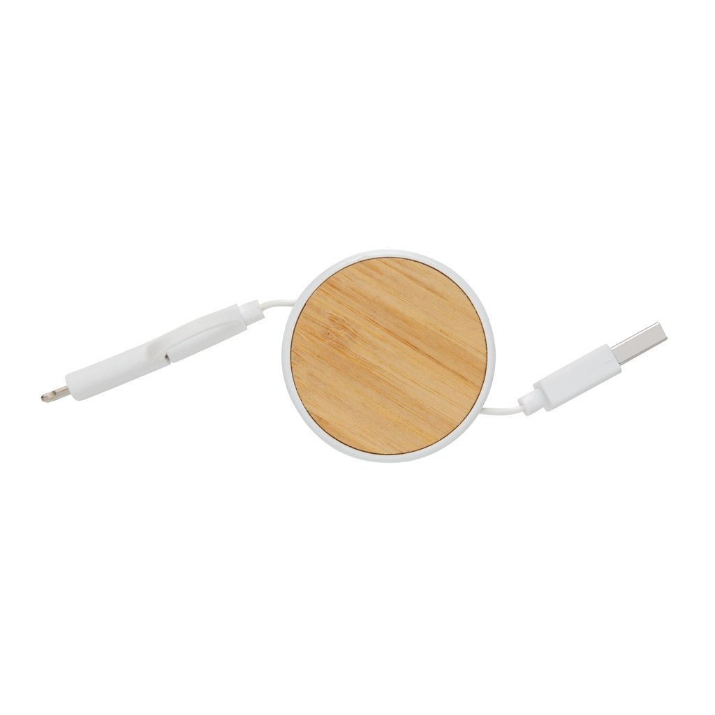Compacte en intrekbare ECO 3-in-1 oplaadkabel met type C en dubbelzijdige connector voor IOS- en Android-apparaten die micro-USB vereisen. Door het intrekbare mechanisme kan de 100 cm lange platte kabel eenvoudig overal mee naartoe worden genomen zonder dat deze verstrikt raakt. Natuurlijke bamboe en ABS-behuizing met TPU-materiaal kabel. Verpakt in ECO papieren zak.