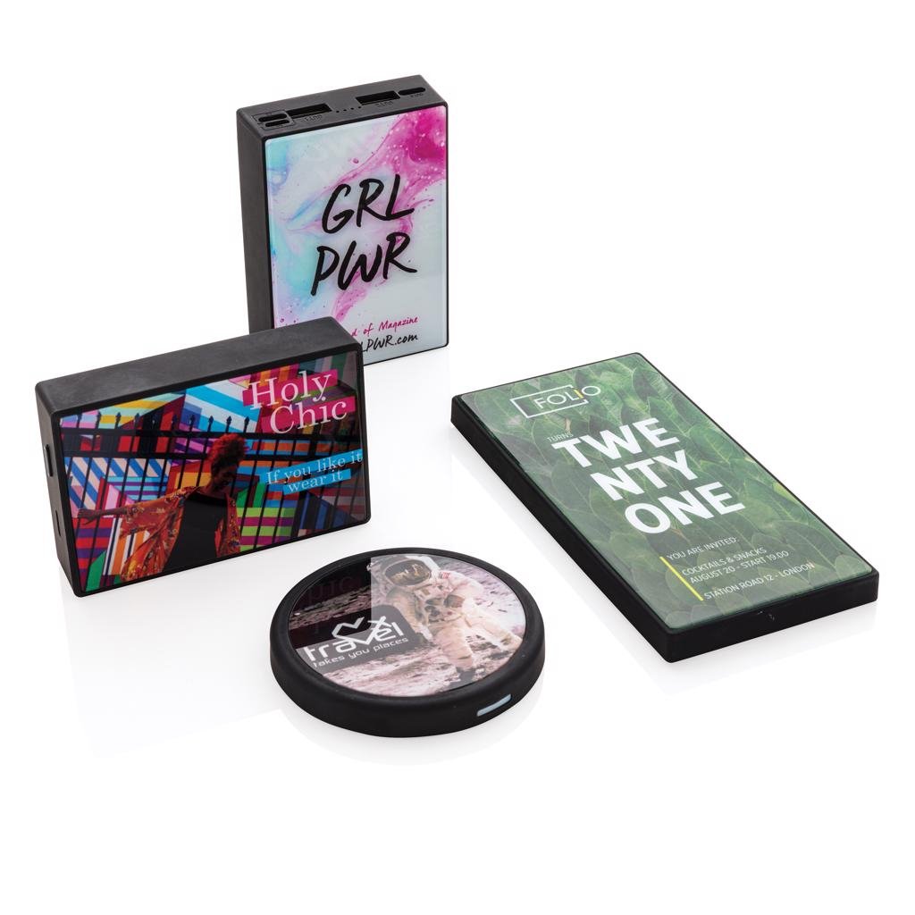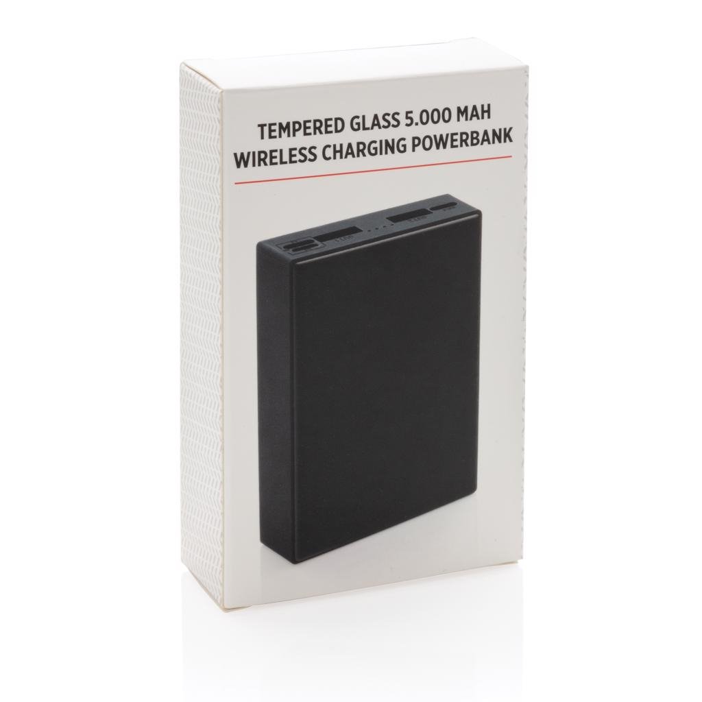 Moderne en luxe 5000 mAh draadloze powerbank met gehard glas voor je full color logo voor een hoogwaardige cadeau-ervaring. Gemaakt van ABS-materiaal met voorkant van gehard glas. Draadloos opladen compatibel met alle QI-apparaten zoals de nieuwste generatie Android, iPhone 8 en hoger. Voor het opladen via kabel heeft de powerbank dubbele USB-poorten en één type C-uitgang. Met batterij-indicator om het resterende energieniveau weer te geven. De powerbank bevat een duurzame kwaliteit A 5.000 mAh lithium-polymeerbatterij. Type-C-ingang 5V/2A, Micro USB-ingang 5V/2A, USB-uitgang 5V/2A, Type C-uitgang: 5V/2A. Inclusief PVC-vrije TPE micro usb-kabel voor opladen.