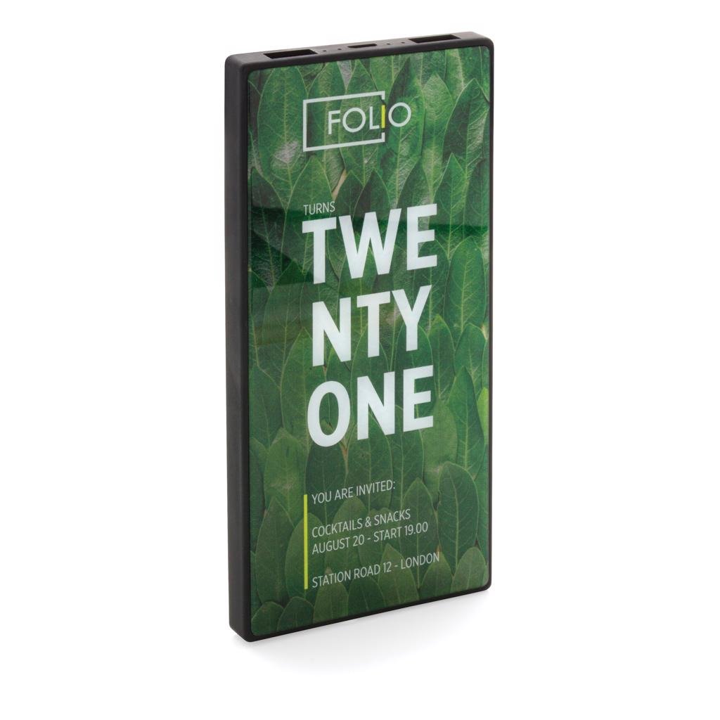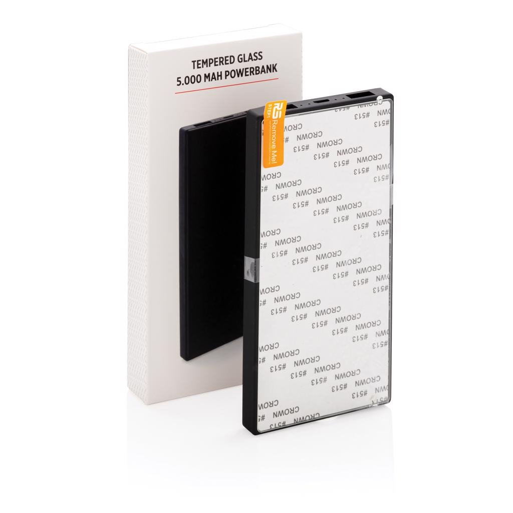 Moderne en luxe 5000 mAh powerbank met gehard glas voor je full color logo voor een hoogwaardige cadeau-ervaring. Gemaakt van ABS-materiaal met voorkant van gehard glas. De powerbank heeft een dubbele USB-uitgang om twee apparaten tegelijkertijd op te laden. Met batterij-indicator om het resterende energieniveau weer te geven. De powerbank bevat een duurzame kwaliteit A 5.000 mAh lithium-polymeerbatterij. Micro USB-ingang 5V/2A; 2x USB-uitgang 5V/2A. Inclusief PVC-vrije TPE micro usb-kabel voor opladen.