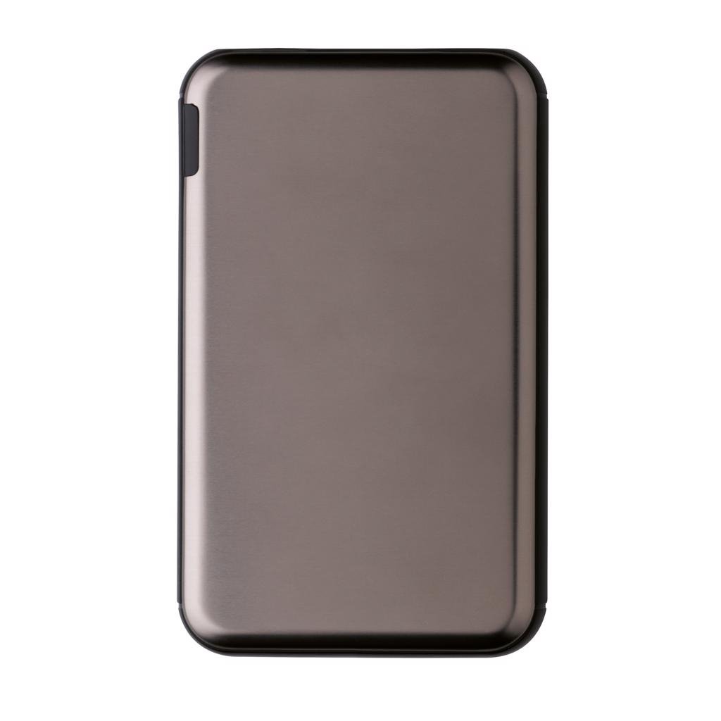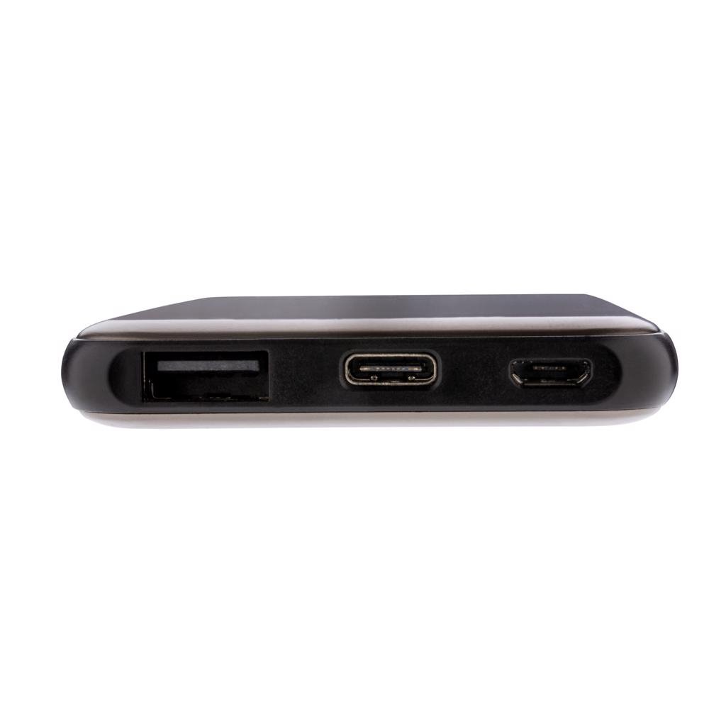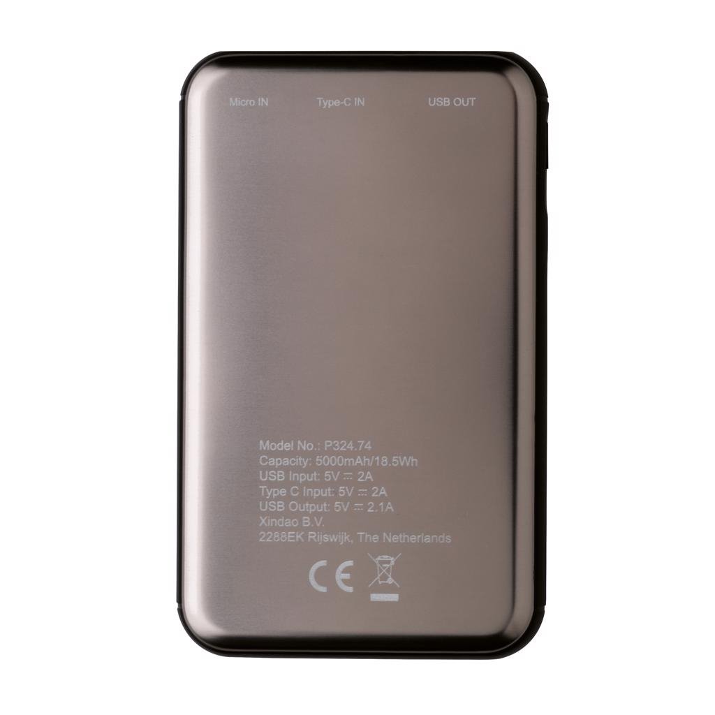 Ultra platte 5.000 mAh powerbank is gemaakt van een hoogwaardige aluminium legering die zo perfect in jouw zak past dat je het overal mee naar toe kunt nemen. Als deze volledig is opgeladen, beschik je over voldoende energie om jouw mobiele telefoon maximaal 2 keer op te laden. De powerbank bevat een duurzame high density lithium-polymeerbatterij van 5.000 mAh. De lichten geven het resterende energieniveau aan, zodat je altijd weet wanneer jouw het apparaat opnieuw moet opladen. Micro USB-poortingang: 5V/2A; Type C-ingang: 5V/2A; Uitgang: USB 5V/2.1A.