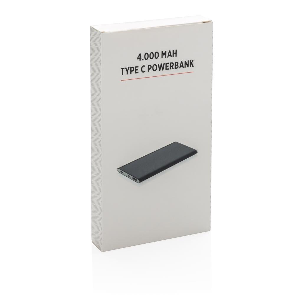 4.000 mAh powerbank van geanodiseerd aluminium. De powerbank heeft zowel een USB als een type C output. Met dit apparaat kan je met iedere willekeurige kabel jouw mobiele apparaat opladen. Output 5V/2.1A, input 1A.