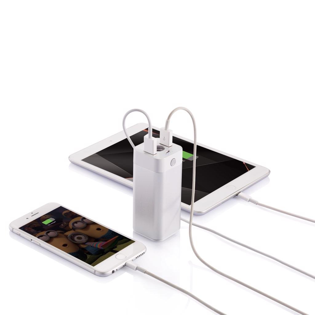 Stijlvol en krachtige aluminium powerbank met 8.000 mAh batterij. Inclusief 2 USB poorten waarmee 2 apparaten kunnen worden opgeladen. De 2A output levert genoeg energie om een tablet op te laden. Output 5V/2A en input 5V/1A. Inclusief micro USB kabel.