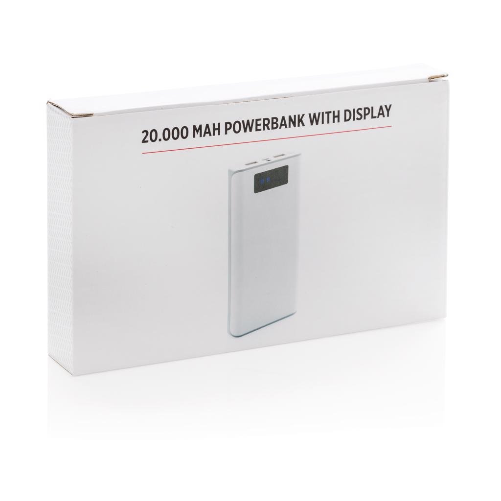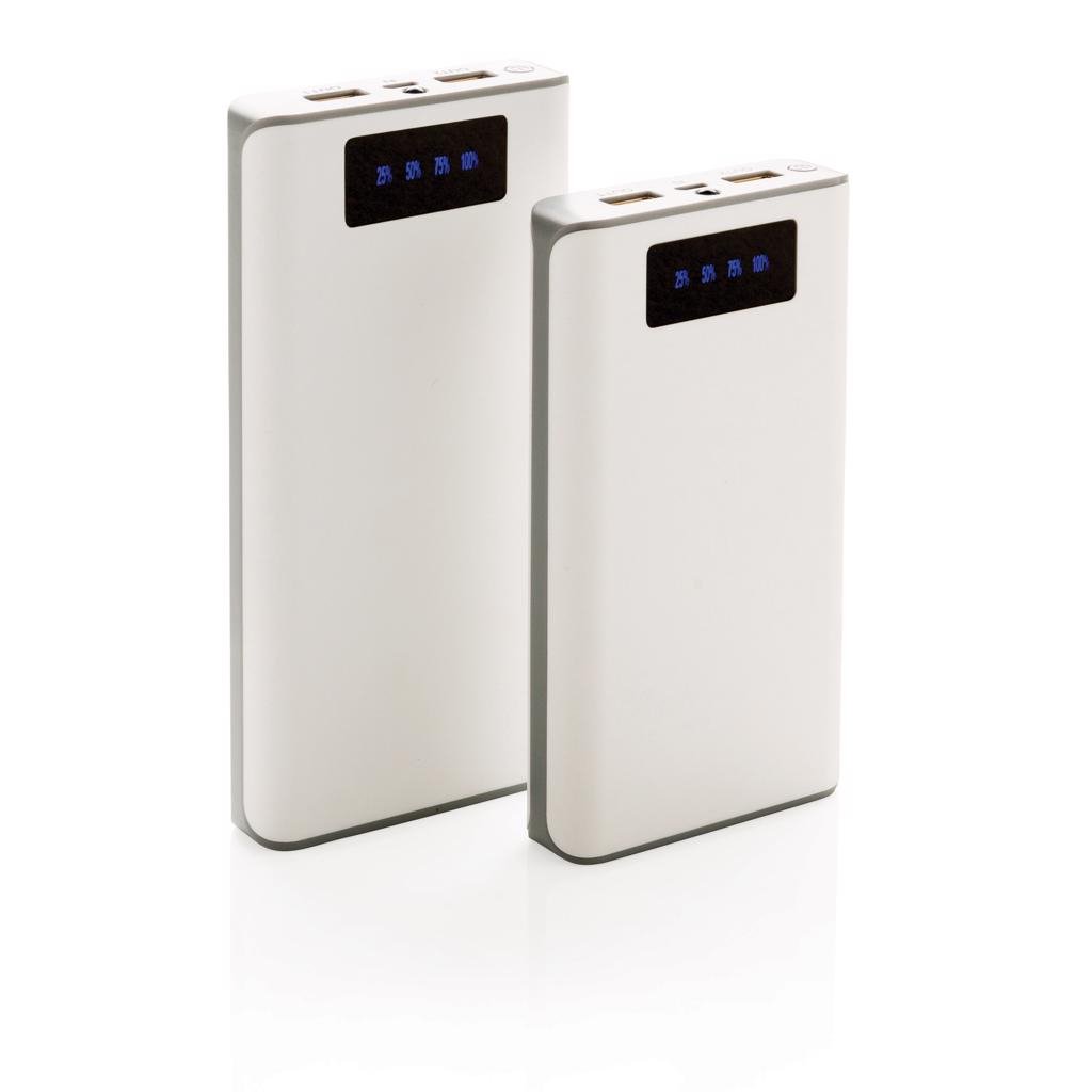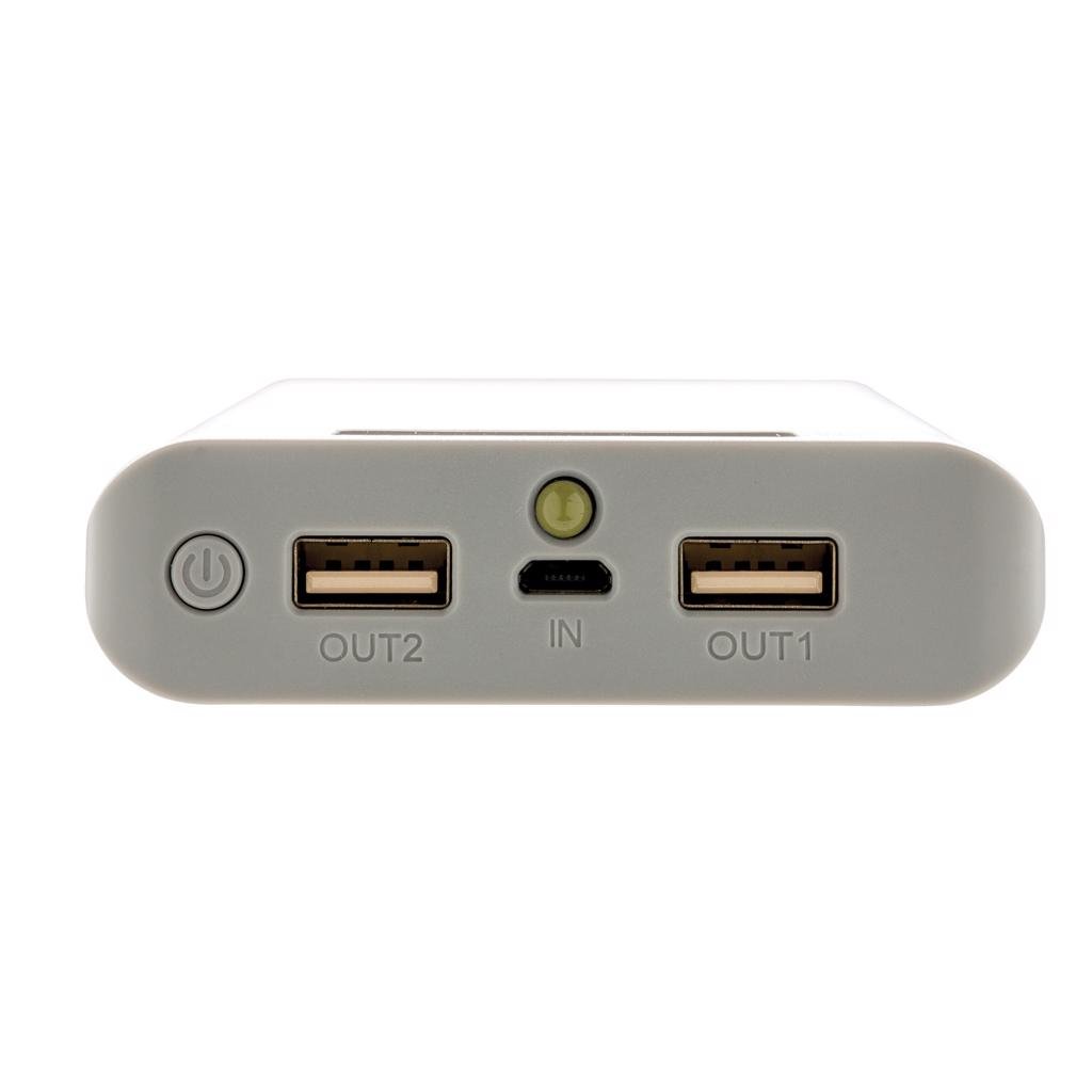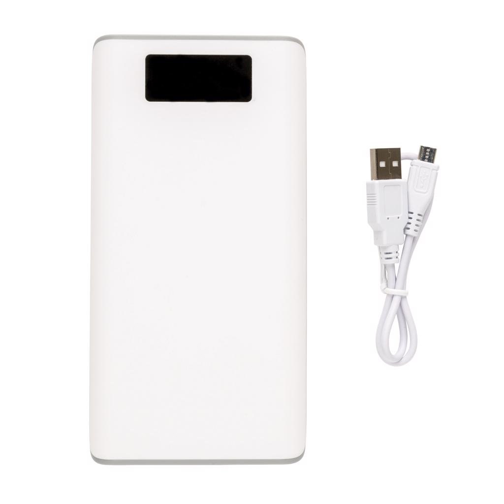 Powerbank met 20.000 mAh lithium batterij en batterij indicator om de beschikbare energie weer te geven (25%-50%-75%-100%). De powerbank beschikt over 2 USB poorten (max 2.1A) om twee apparaten tegelijk te kunnen laden. ABS materiaal. Output: 5V/2.6A, input 5V/2A. Inclusief micro USB kabel.