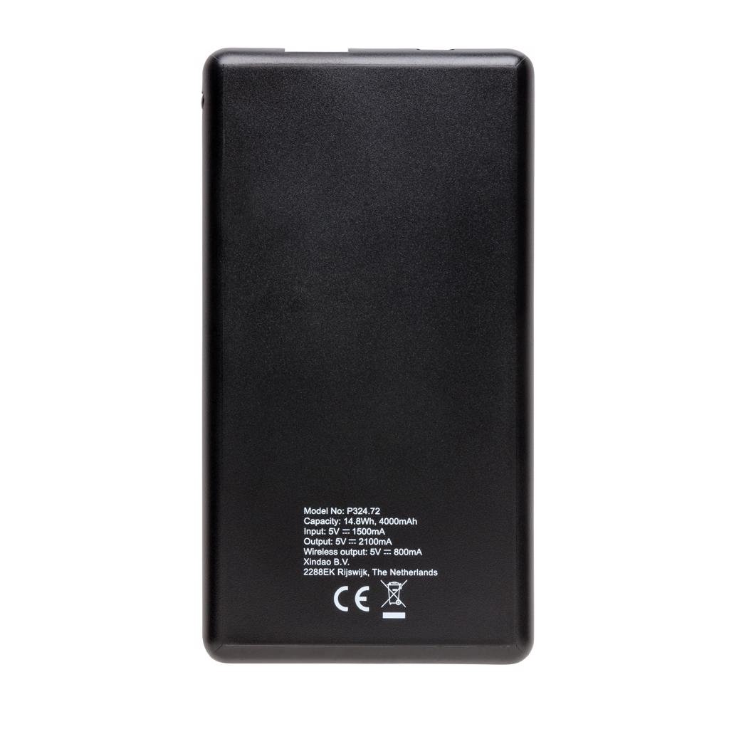 4000 mAh ABS wireless charging powerbank met lithium-polymeerbatterij van hoge kwaliteit. Inclusief aan/uit-knop en indicatielampjes om de resterende capaciteit te tonen. De powerbank heeft een geïntegreerde 5W draadloze oplader om jouw mobiele telefoon draadloos op te laden. Compatibel met alle QI-apparaten zoals Android nieuwste generatie, iPhone 8 en hoger. USB-input: 5V/2.1A. Output: 5V/1.5A. Draadloze output: 5V/1A 5W. Inclusief micro-USB-kabel.
