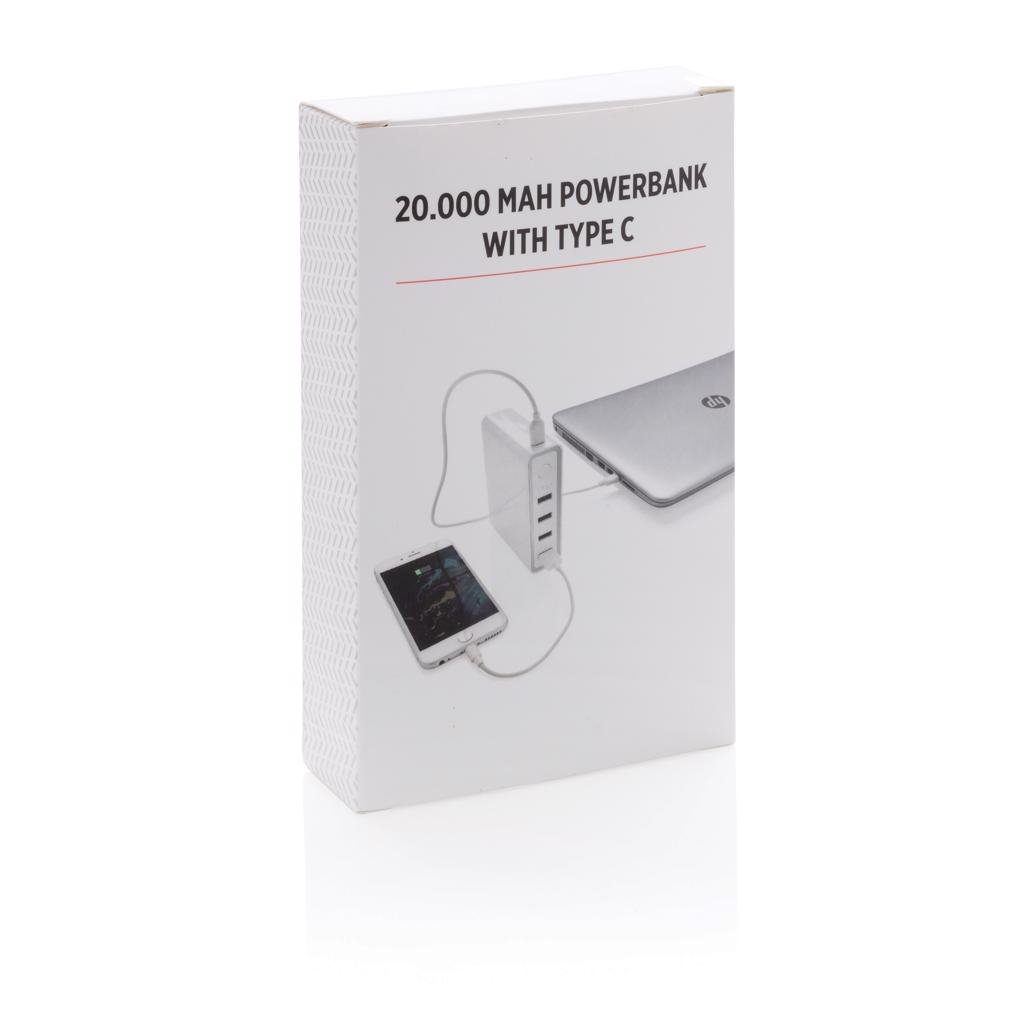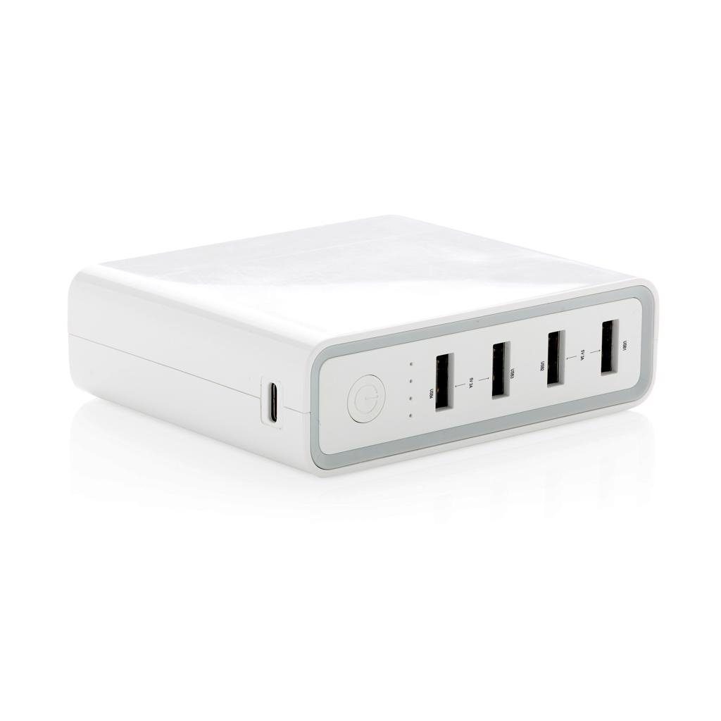 Krachtige powerbank met 20.000 lithium batterij met 4 USB poorten en een type C 3.0 poort (ingang en uitgang). Het item kan zowel via de micro USB-poort (2A) worden opgeladen als via de super snelle type C-poort (2,4 ingang). Uitgang USB-poort: 4x 5V/2A en 1 5V/9V/14.5V/2.4A. Geschikt voor het opladen van telefoons en tablets en zelfs grotere apparaten zoals Macbooks en Nintendo Switch. Gemaakt van duurzaam brandbestendig ABS met UV-finish. Inclusief micro- en type C-kabel.