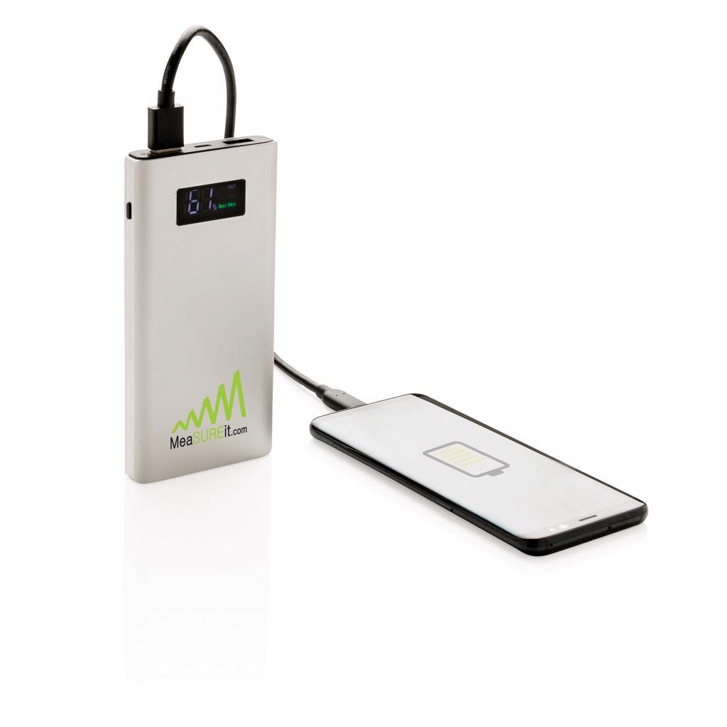 Aluminium powerbank met duurzame 10.000 mAh lithium poly batterij en LCD scherm om de resterende energielevel weer te geven. De powerbank heeft twee USB output poorten waarvan 1 Quick charge 3.0 ondersteunt voor snel en efficiënt laden. Output: DC 5V/3A, 9V/2A, 12V/1.5A, input 5V/3A. Inclusief micro USB kabel.