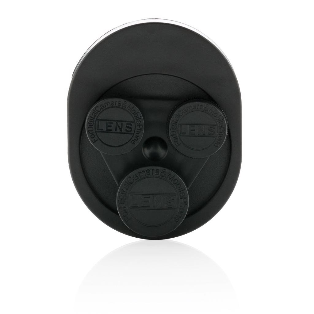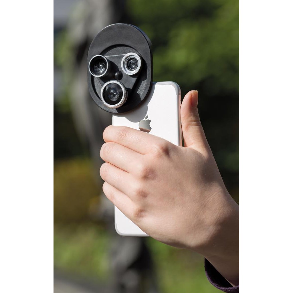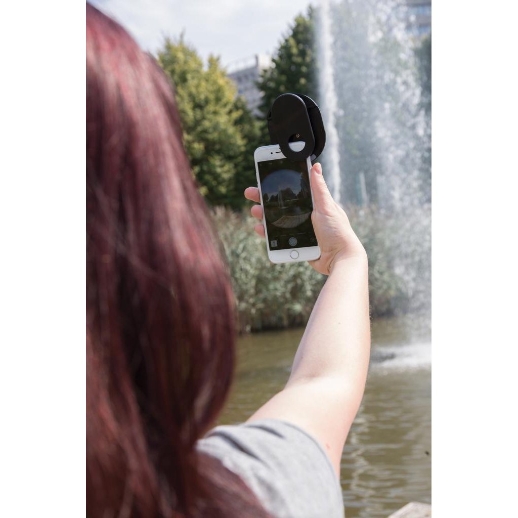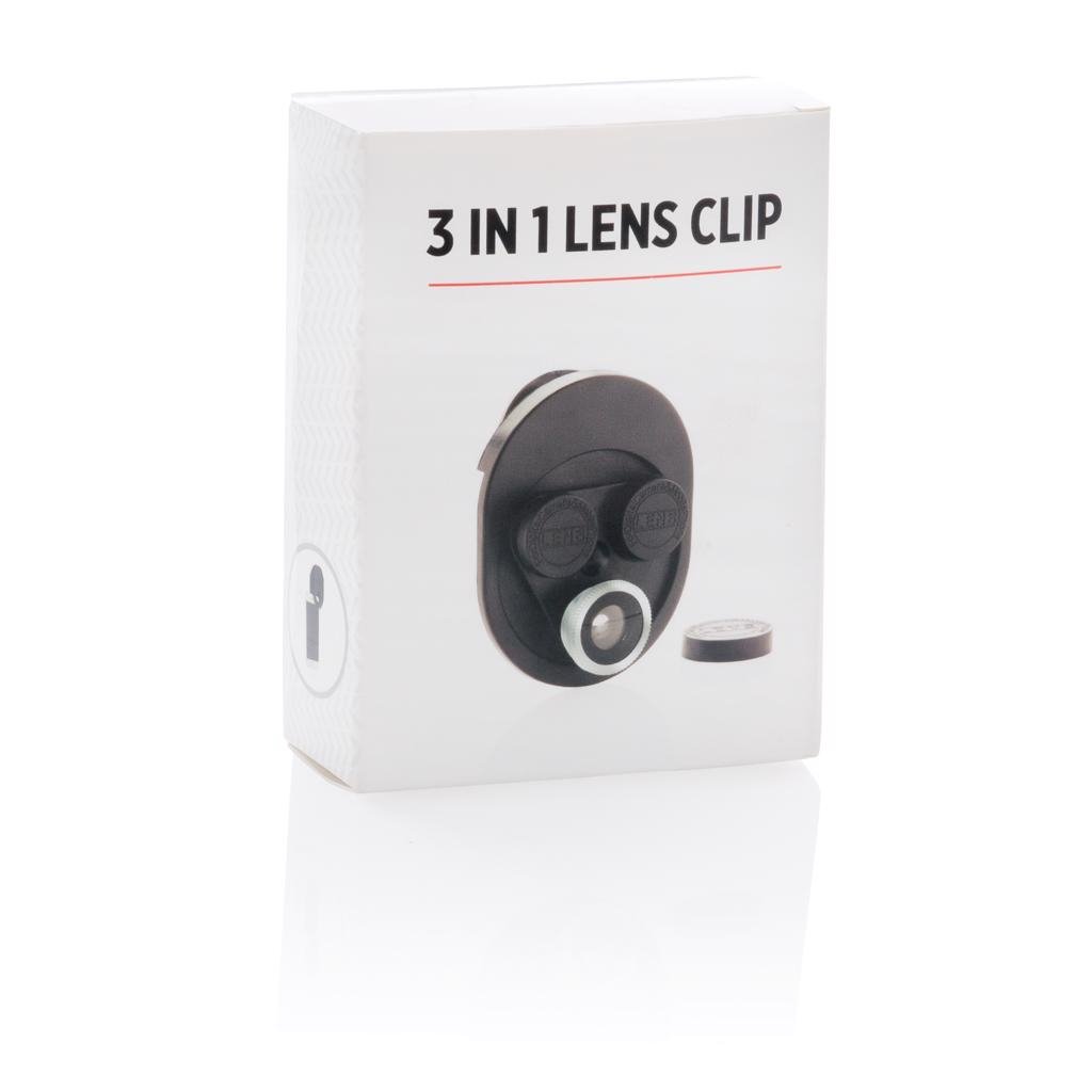 Makkelijk te bevestigen en te gebruiken 3-in-1 lens clip. De lenzen kunnen eenvoudig gedraaid worden naar de lens die je wil gebruiken. De clip heeft 3 soorten lenzen: macro , fish eye en een groothoek lens. De clip is gemaakt van ABS en de lenzen van acryl.