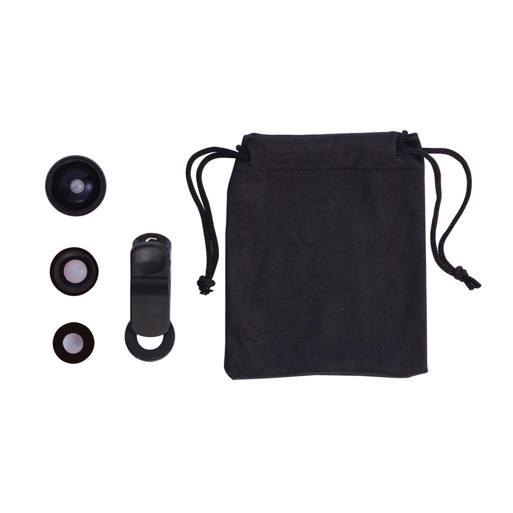 Maak nog mooiere foto's met jouw mobiele telefoon met deze 3-delige lenzen set. De set bestaat uit een fish eye, macro en groothoek lens. Elk van hen kan gemakkelijk aan jouw mobiele apparaat worden gekoppeld. Inclusief zwarte etui om de lenzen overal mee naartoe nemen.