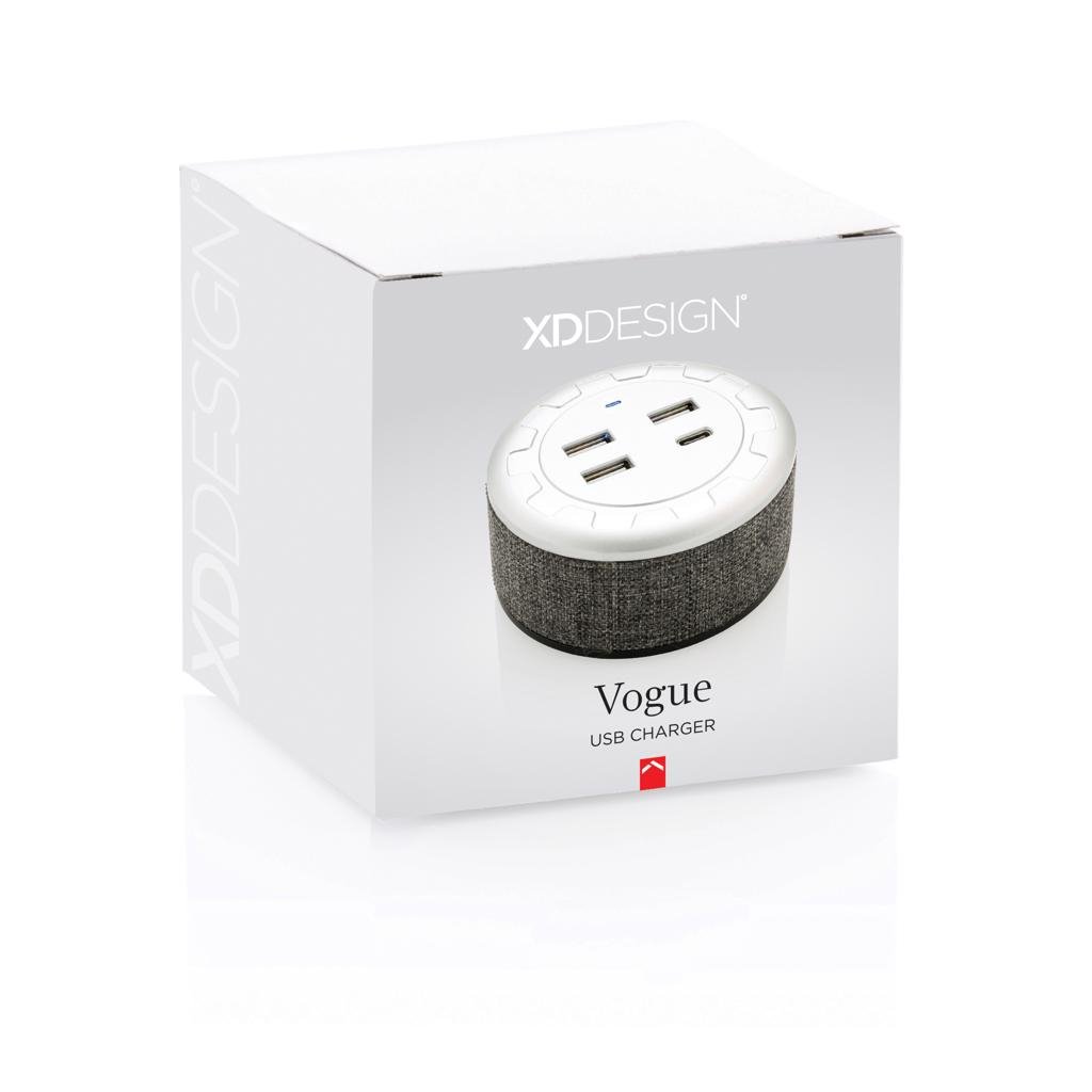 Mode en techniek ontmoeten elkaar in deze trendy USB-oplader. Wordt geleverd met drie USB-poorten en een type C 2.0-poort om de nieuwste generatie mobiele apparaten op te laden. Totale output 4.1A. Met 1.5M EU-kabel. Geregistreerd ontwerp®.